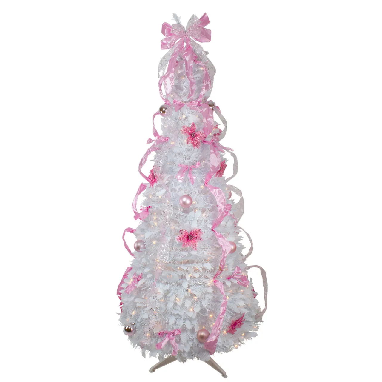 - Predecorated with pink ball ornaments, poinsettias and ribbon
