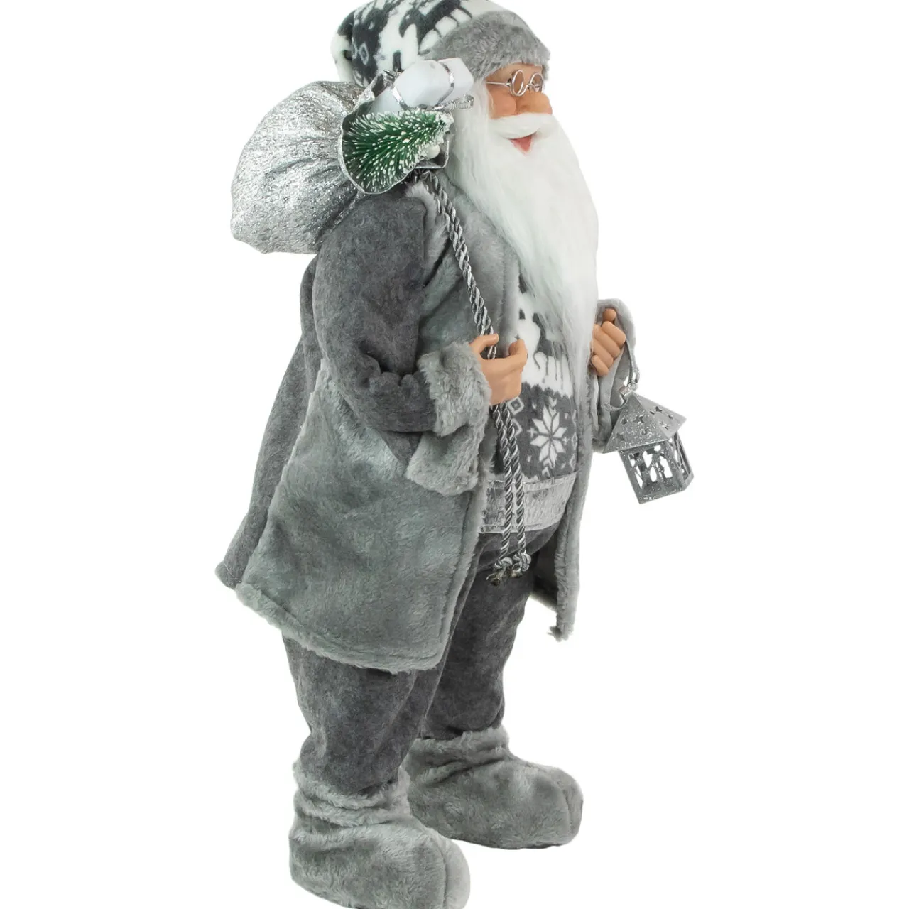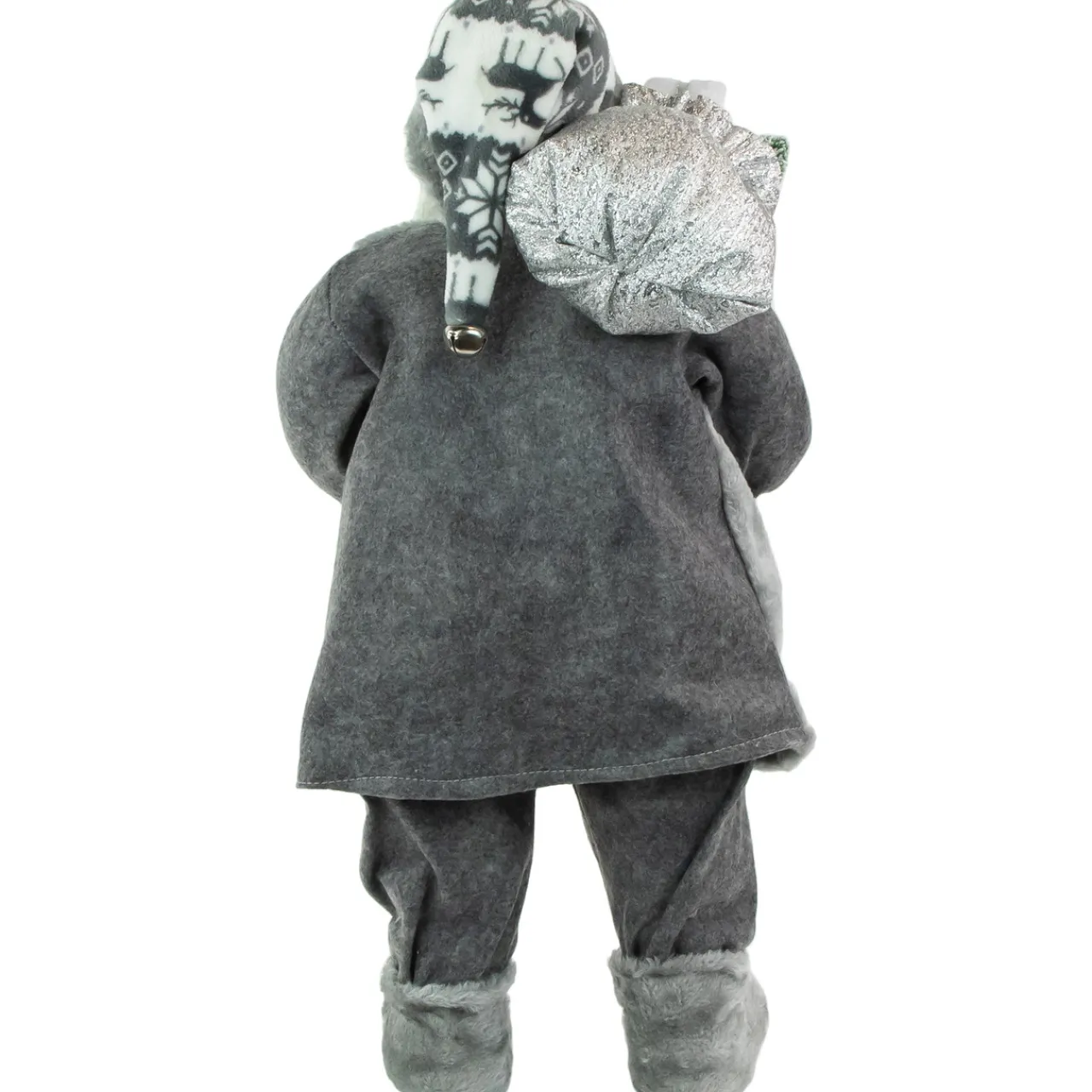 - Santa is wearing a fleece jacket, pants and patterned sweater