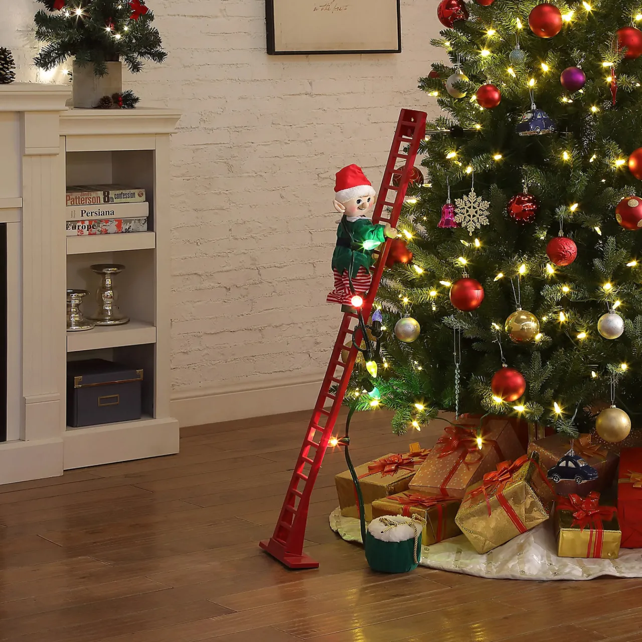 - Elf tirelessly climbs up and down ladder with a strand of lights