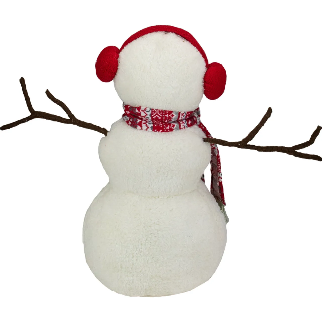 - The snowman is wearing a red white and gray scarf with bendable earmuffs