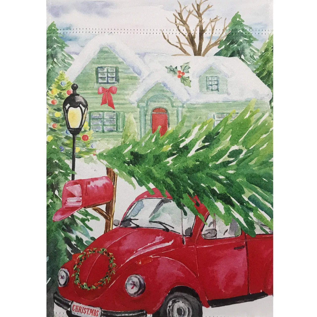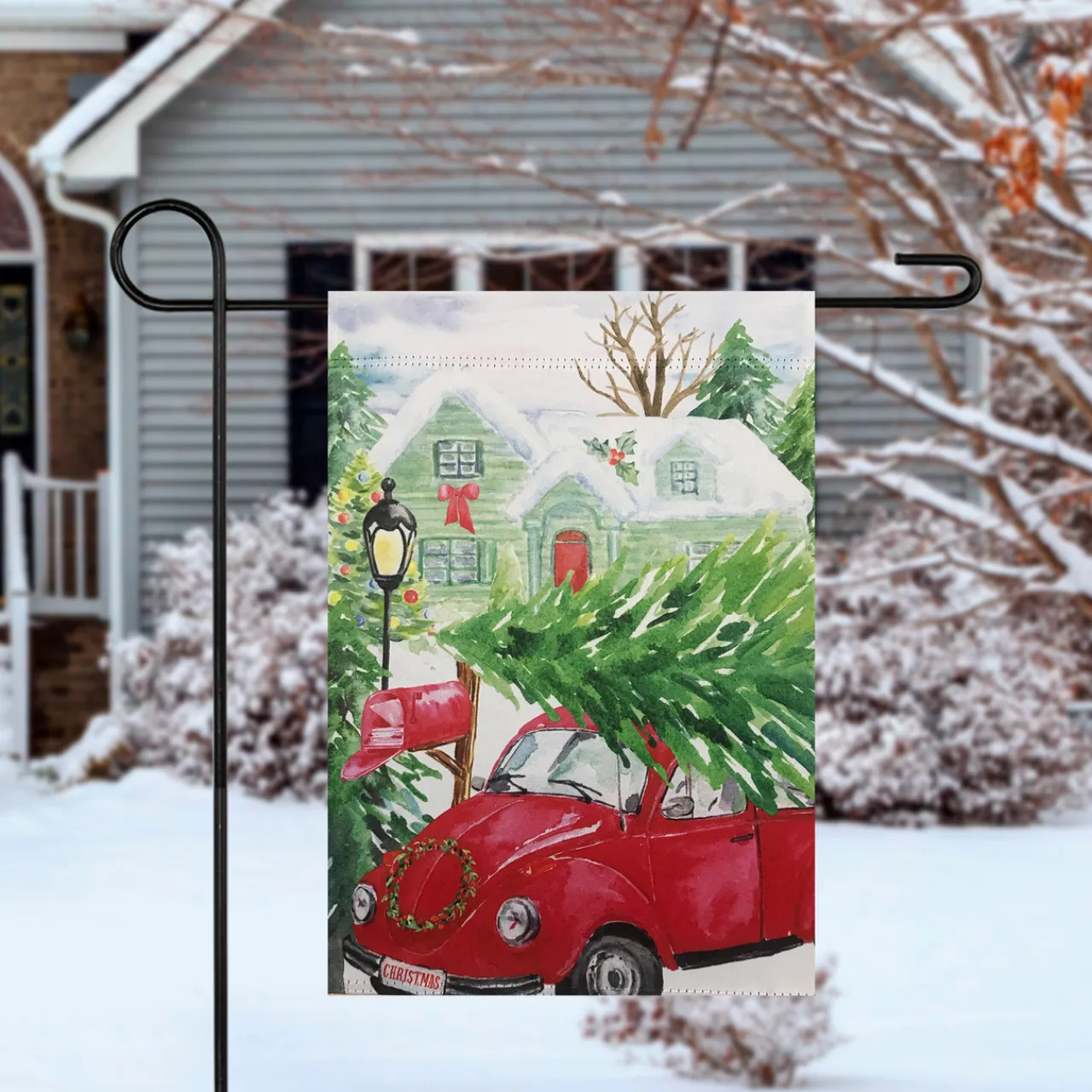 - Red Bug Car Carrying A Fresh Cut Tree Garden Flag