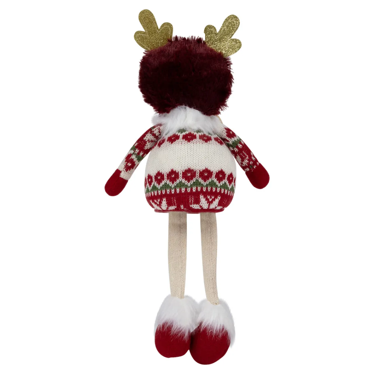 - Dressed in a knitted sweater outfit with red boots and mittens