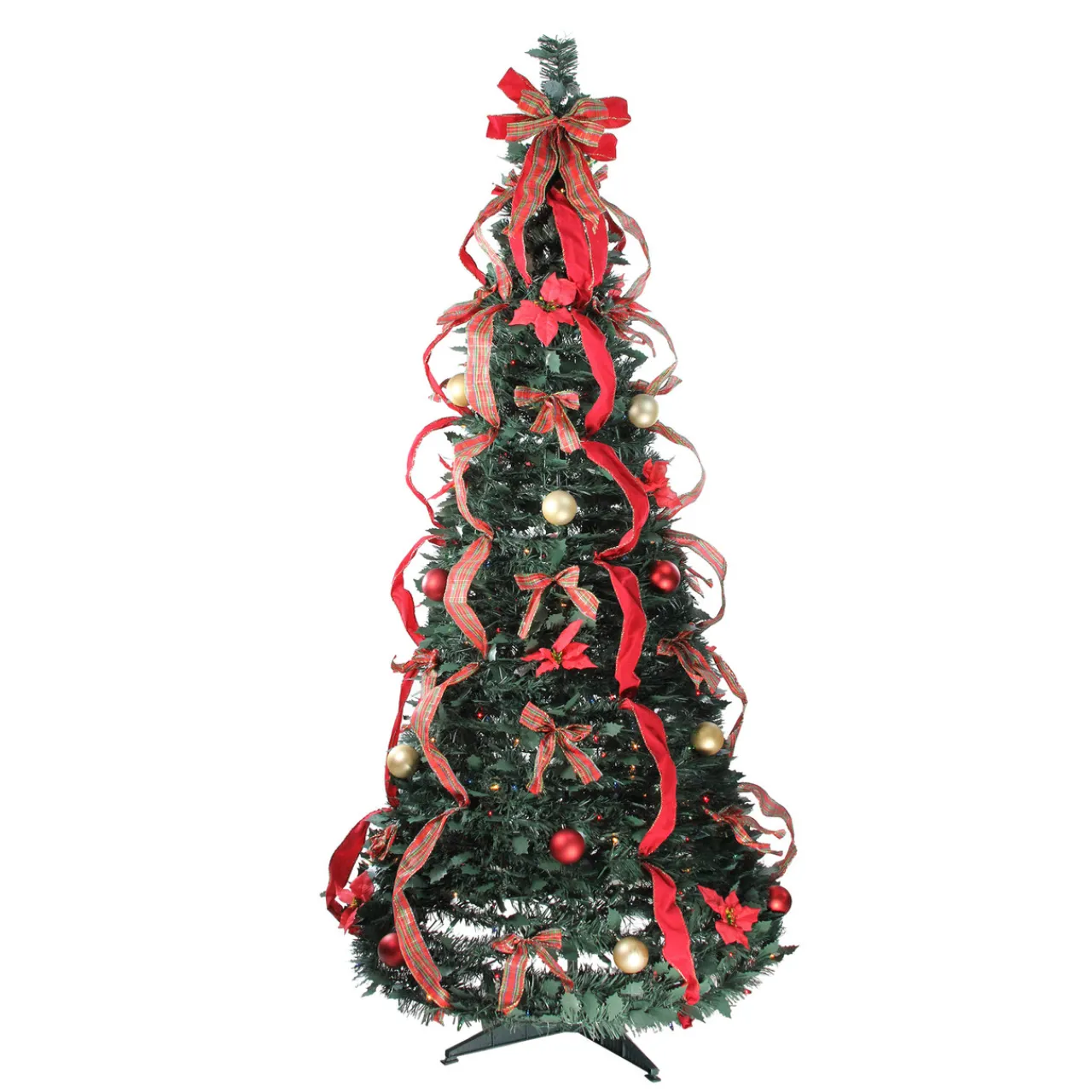 - Pre decorated with red and gold ball ornaments, poinsettias and plaid ribbon