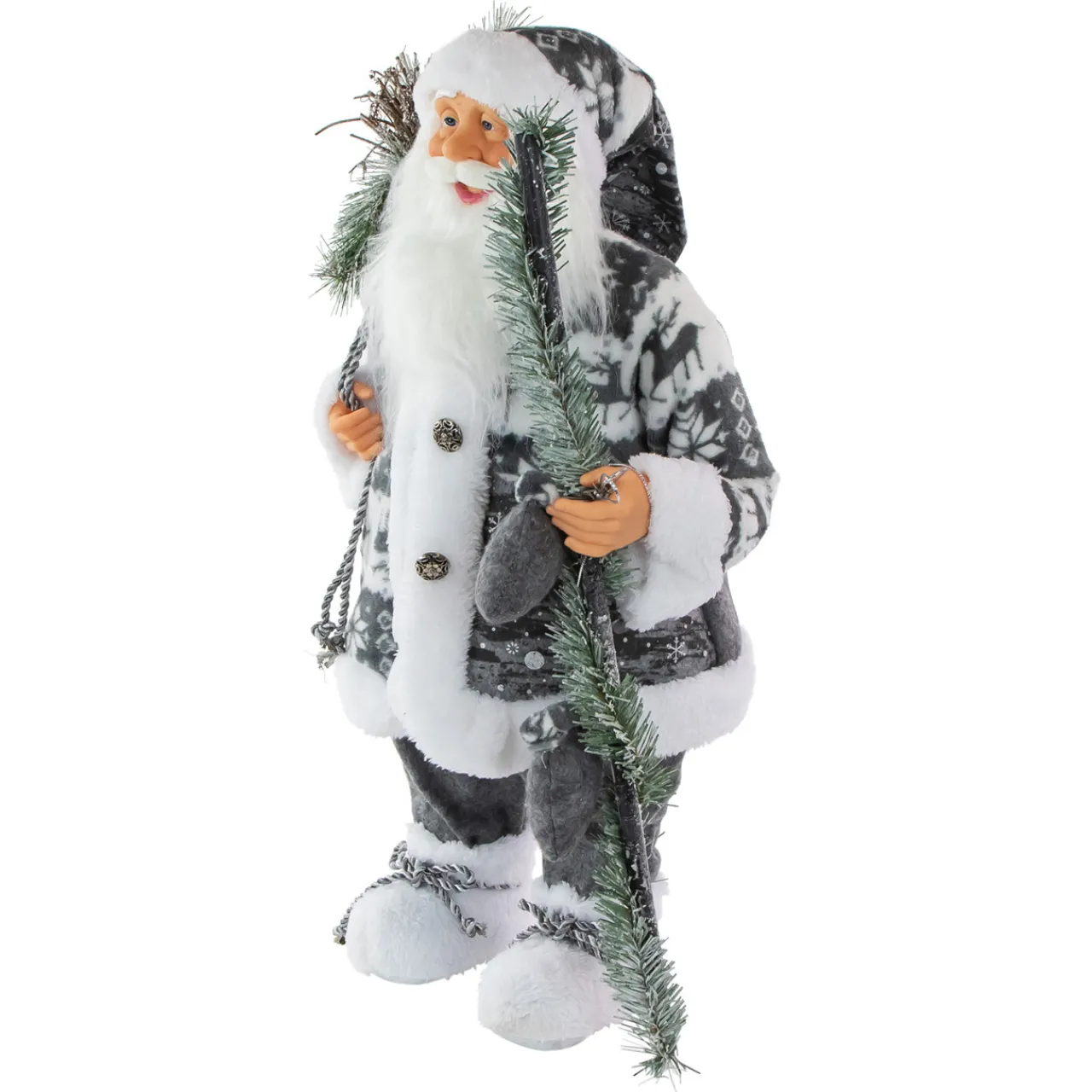 - Santas suit is gray with a lodge pattern and accented with faux fur