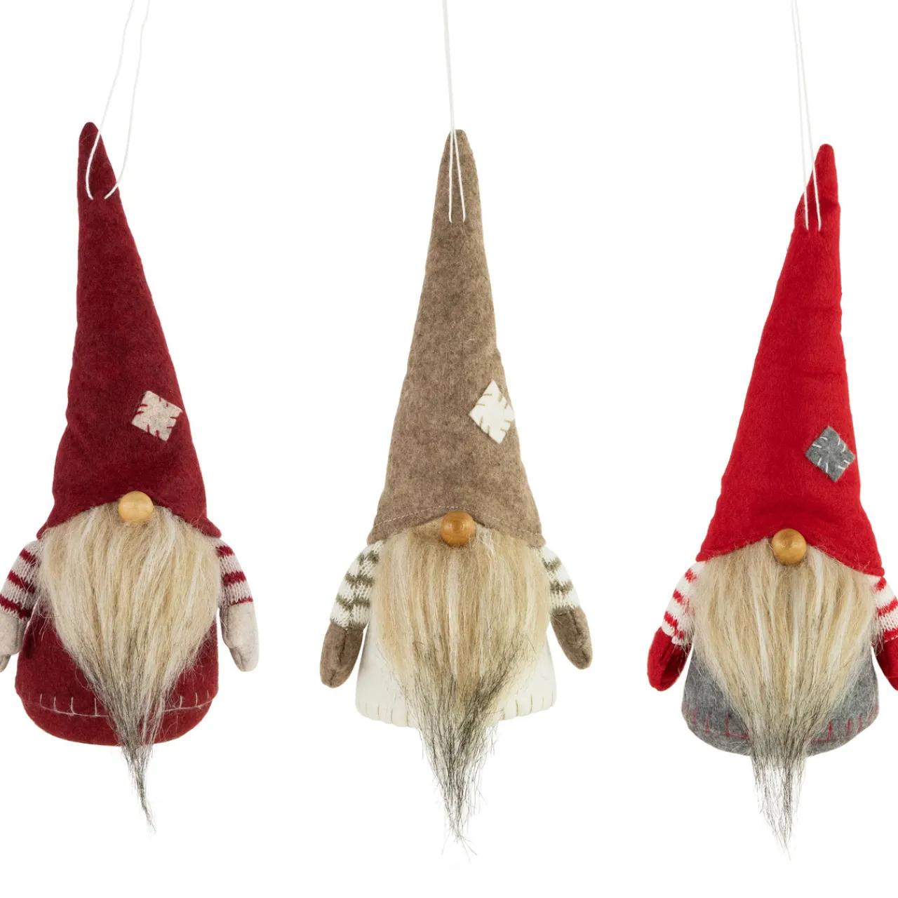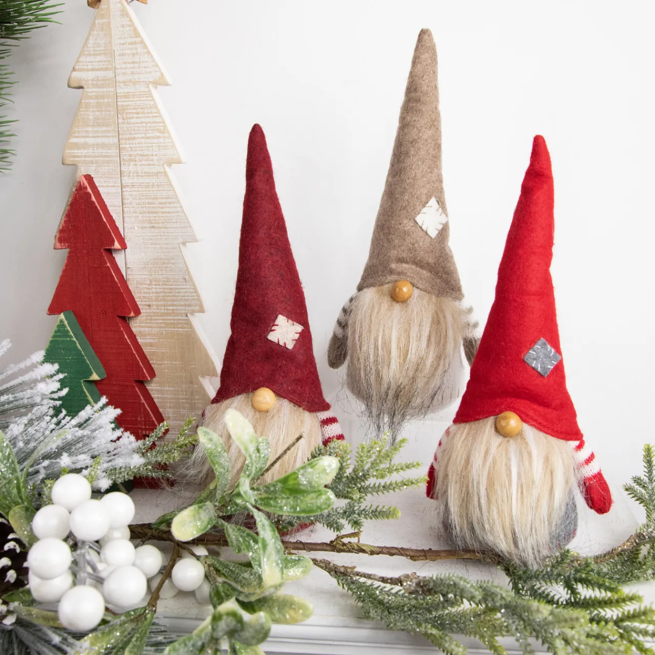 Featuring 3 gnomes, one in red and gray, one in red and one in cream and brown