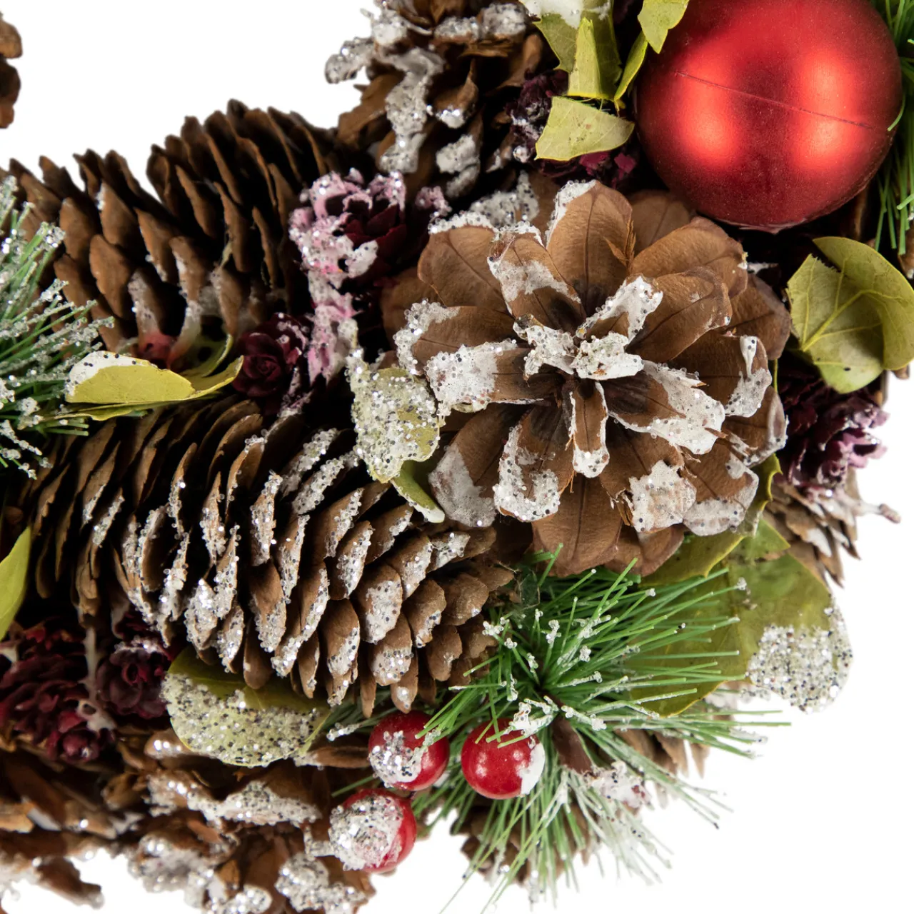 - Accented with frost, glitter and red berries