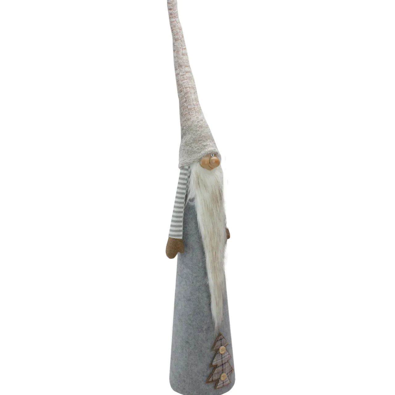 - Wears a gray suit with striped sleeves and a plaid Christmas tree