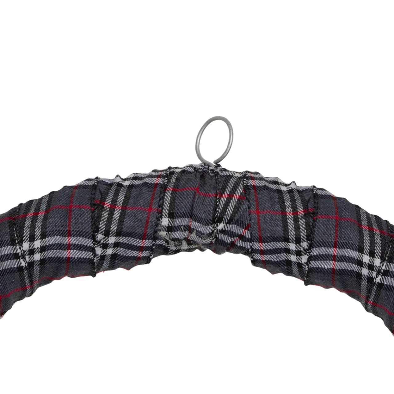 - Accented with a gray and red plaid ribbon and matching bow with foliage, berries and pine cones