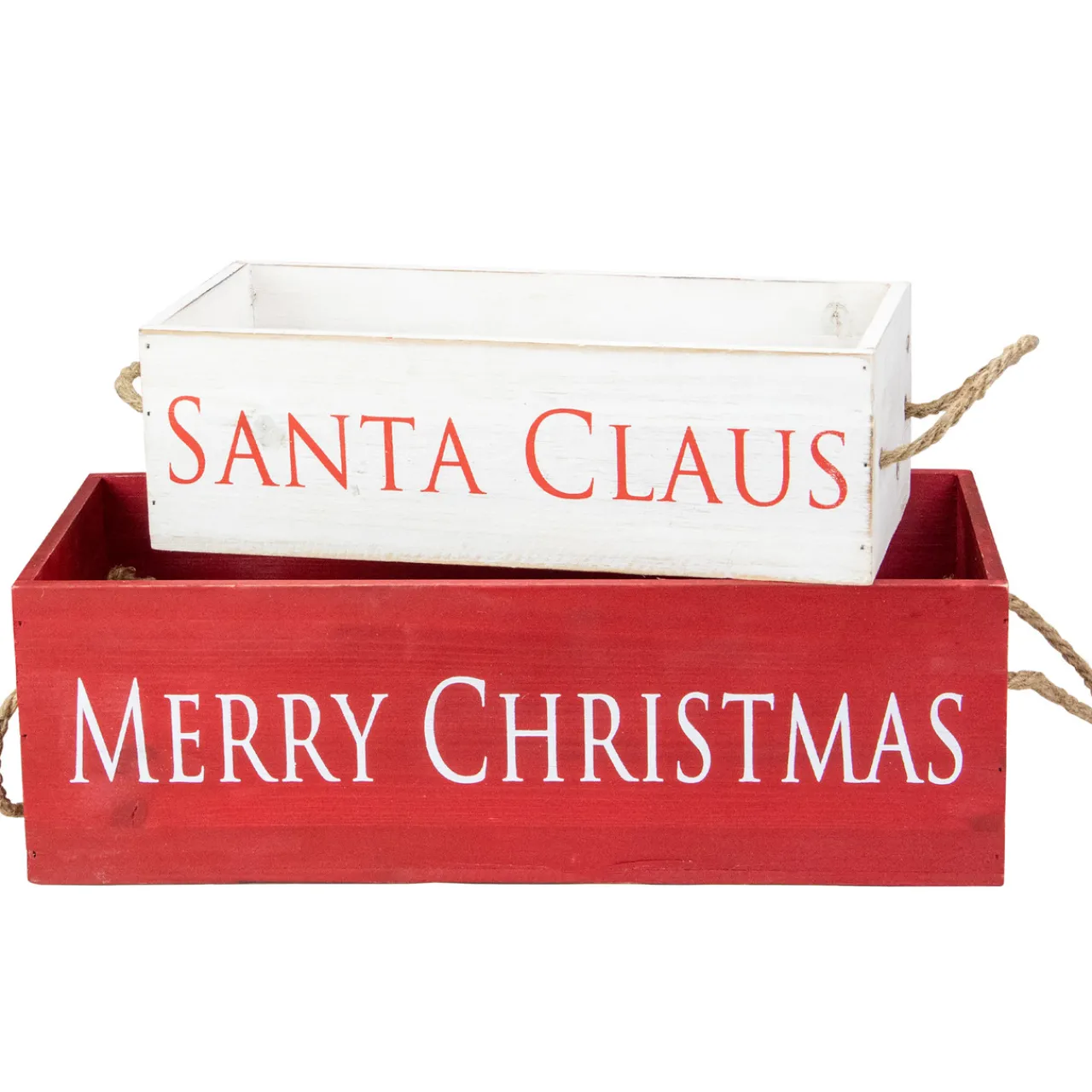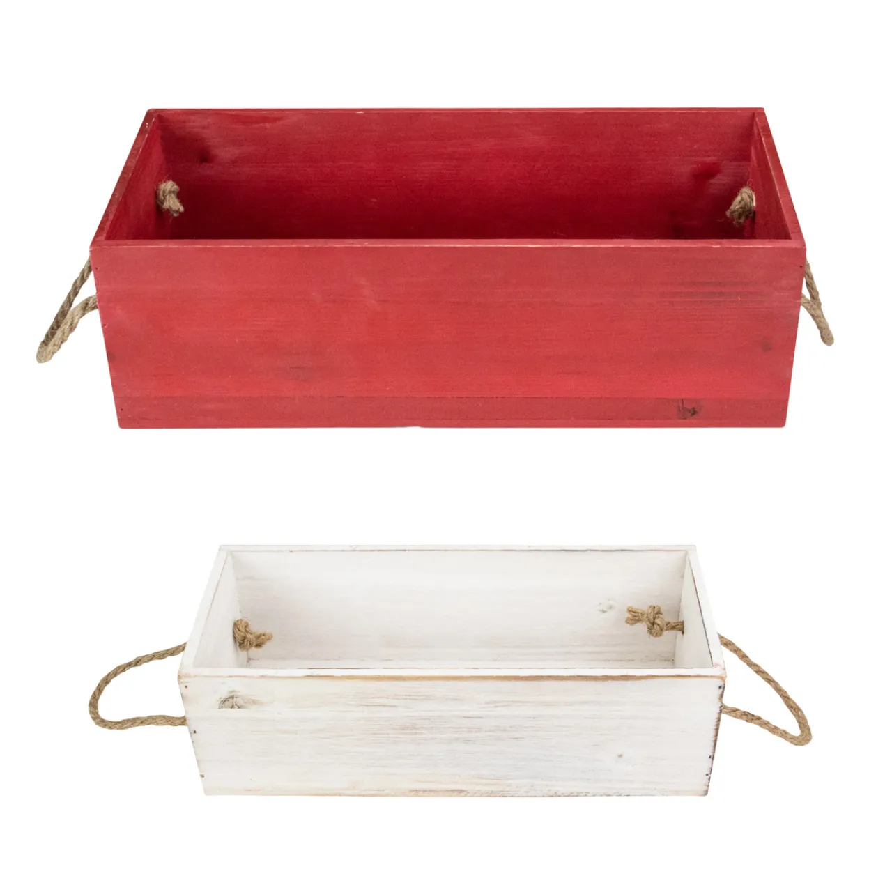 - Each box includes jute rope handles and can be nested together for storage