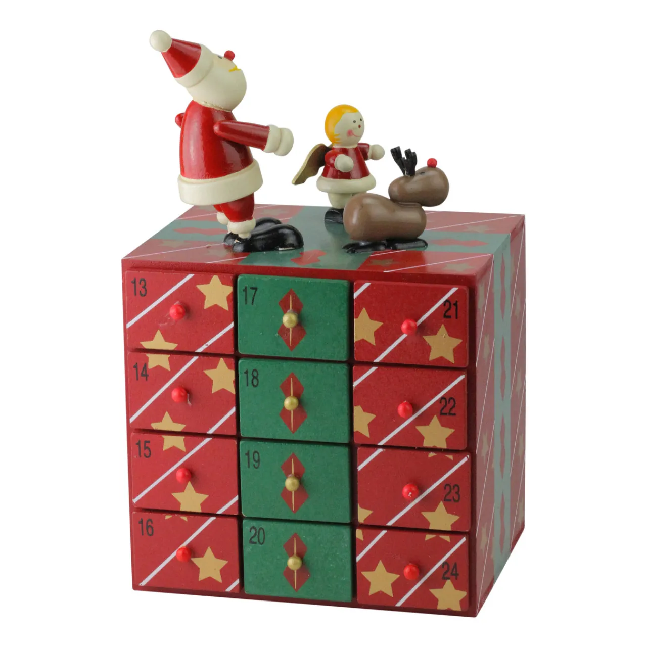 - Features storage boxes with a Santa, angel and reindeer figurine on top