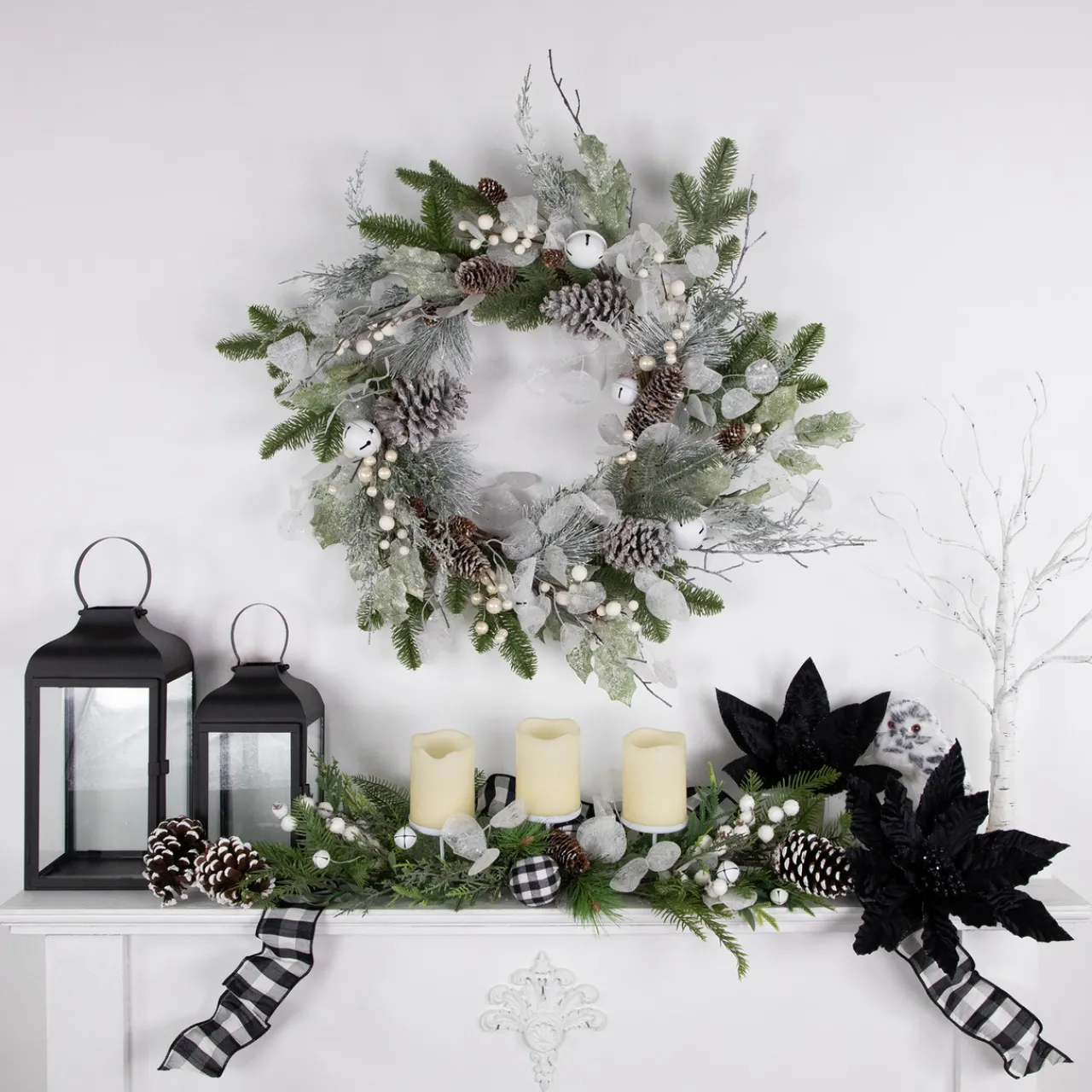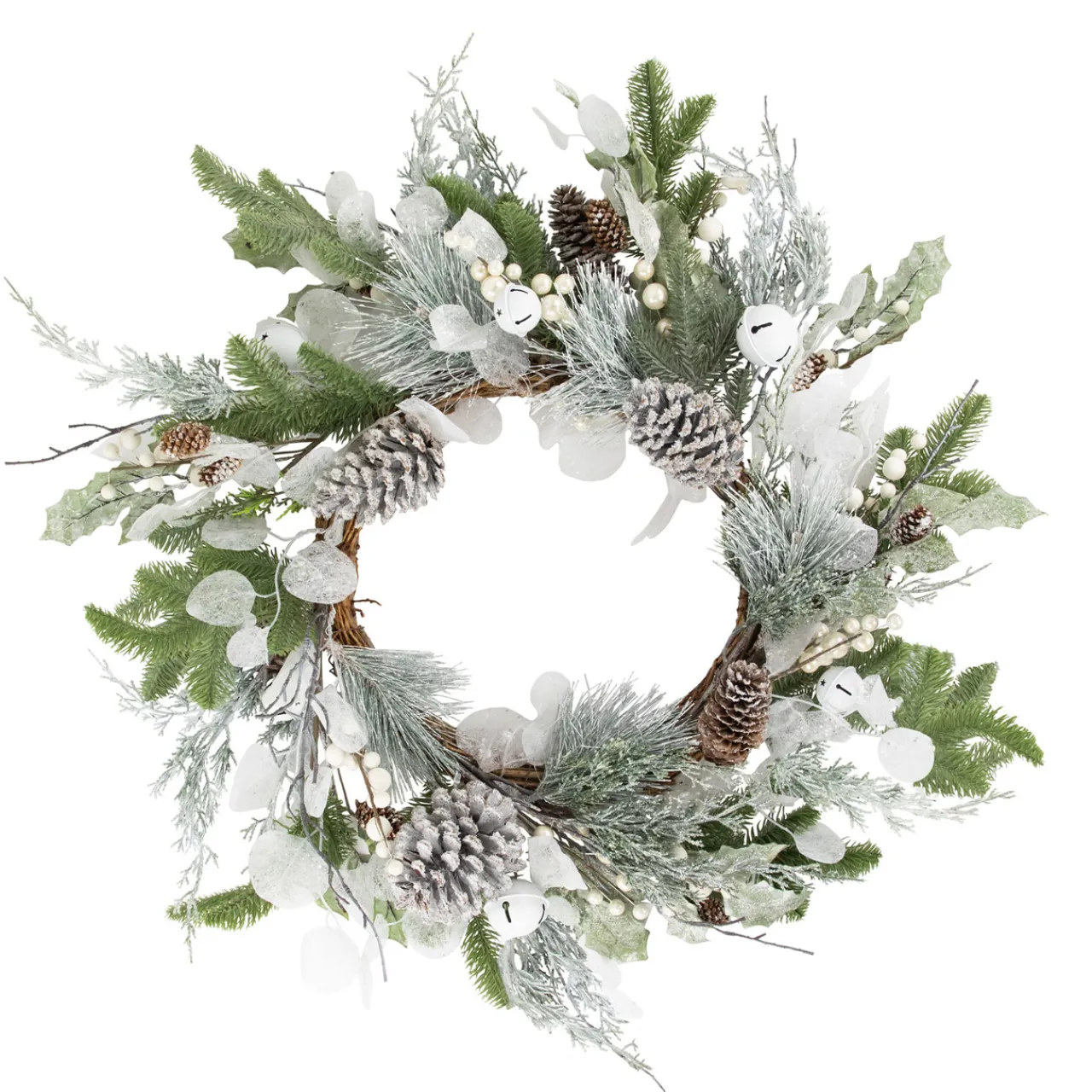 - Accented with foliage, twigs, pearls, pinecones and jingle bells