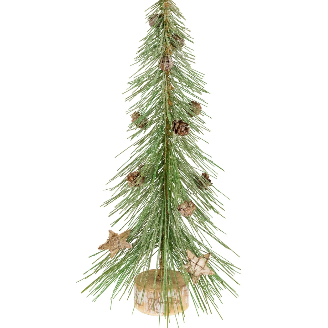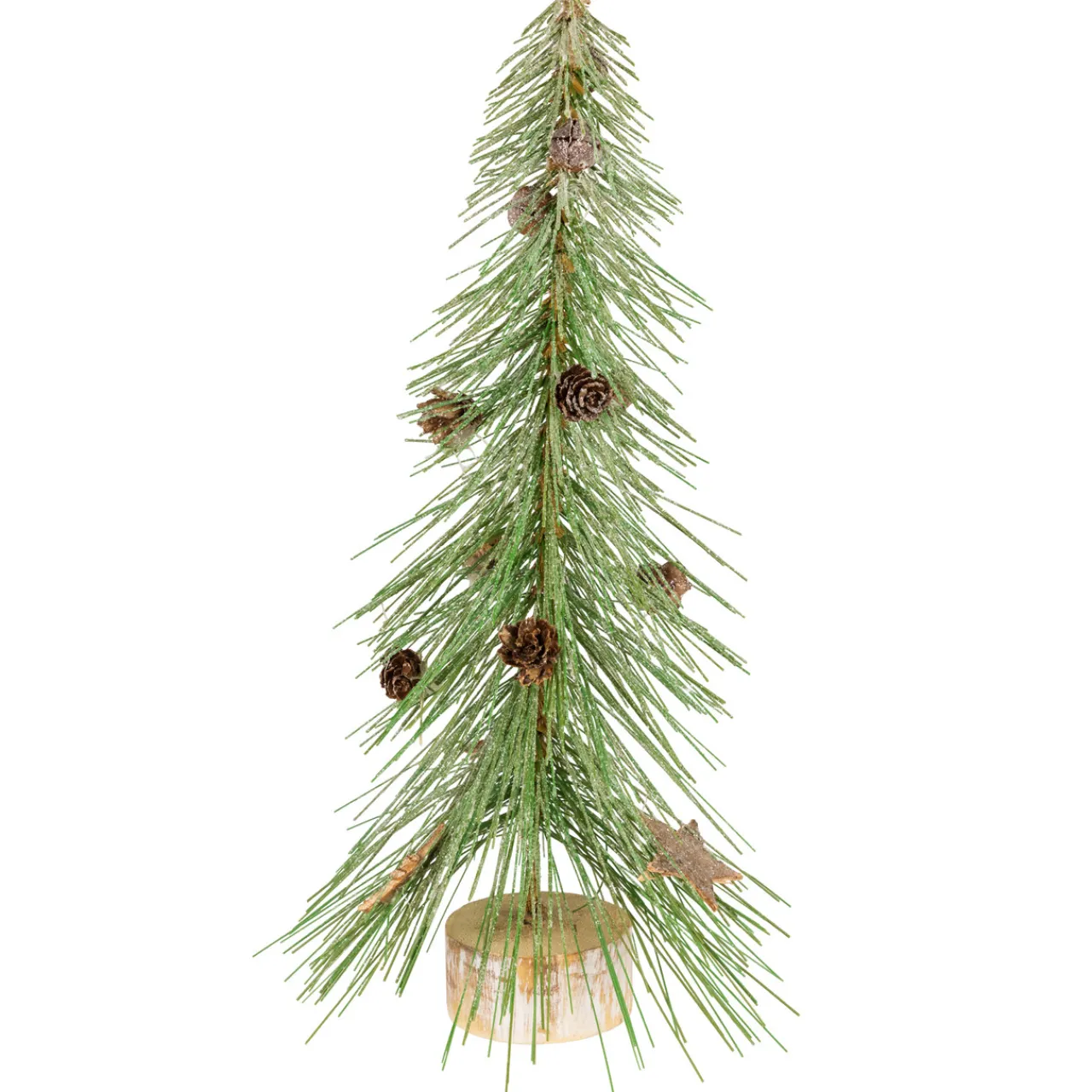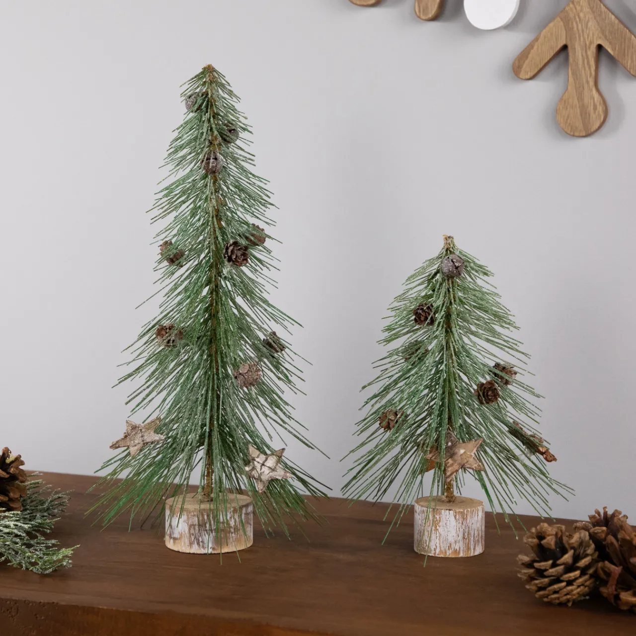 - Adorned with mini pinecones; star cutouts and rustic bells