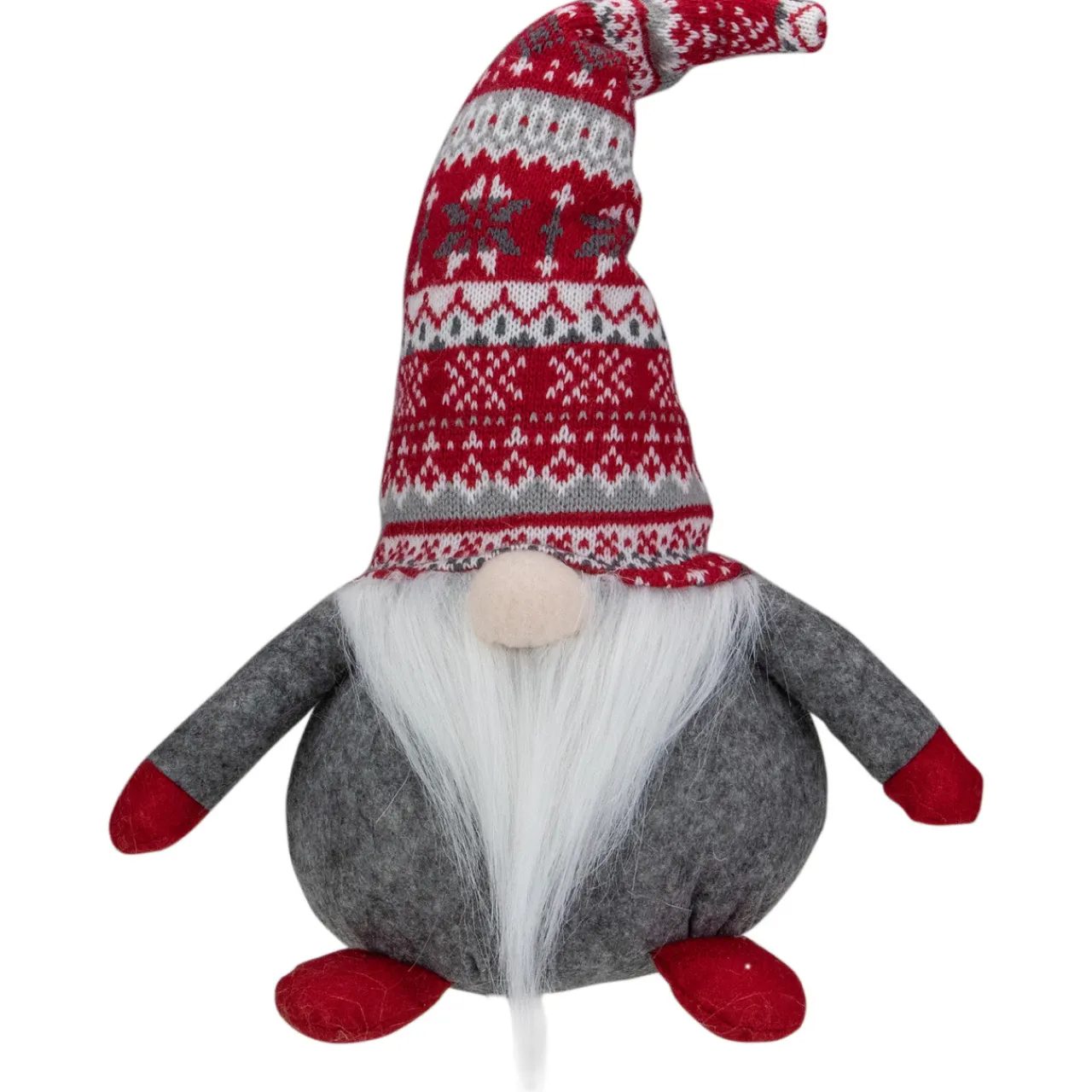 - The gnome has a gray body with a white beard and beige nose