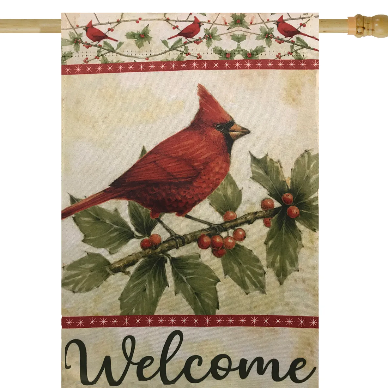 - Double-sided design of a large cardinal sitting on a holly berry branch