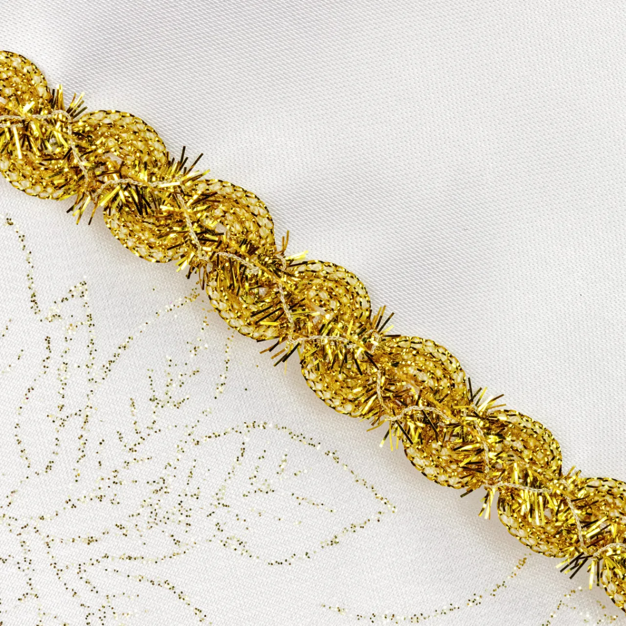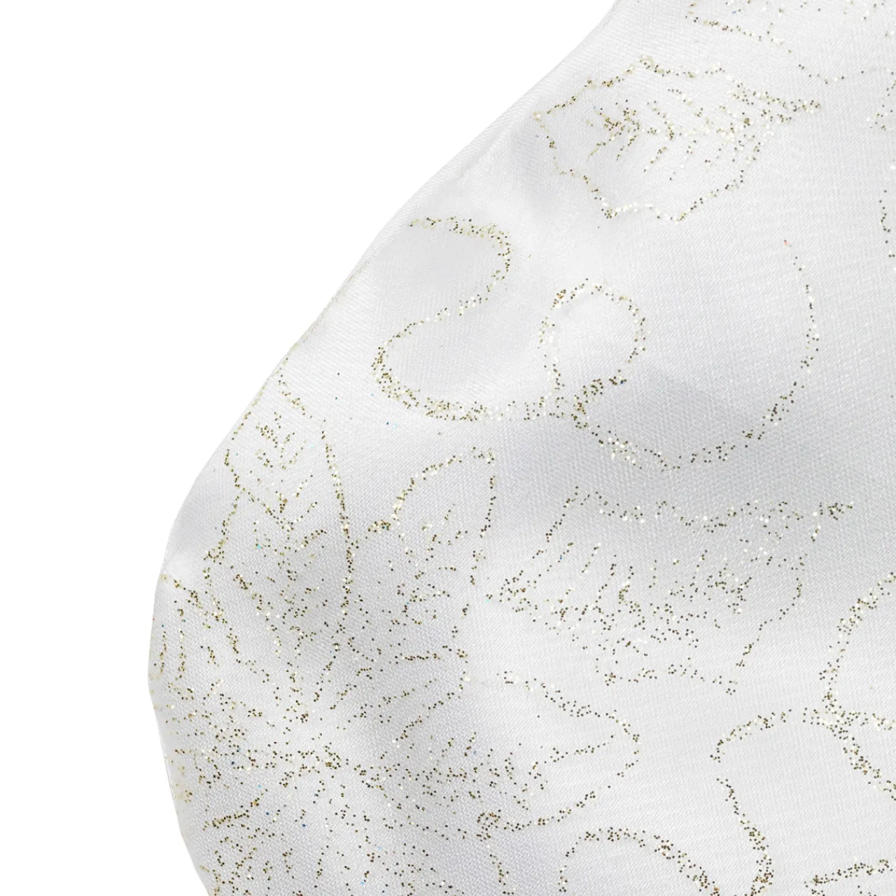 - Features gold glitter poinsettia designs on sheet white organza fabric