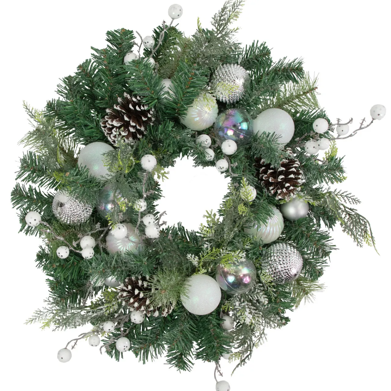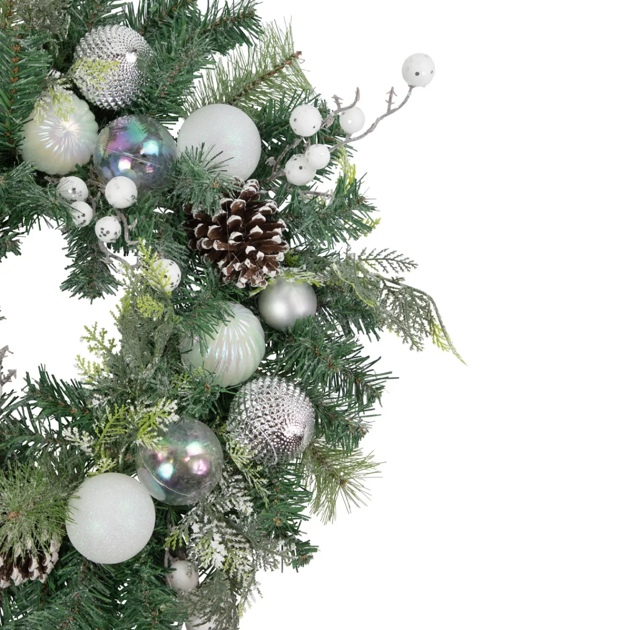 - Pine cones and berries accent the wreath