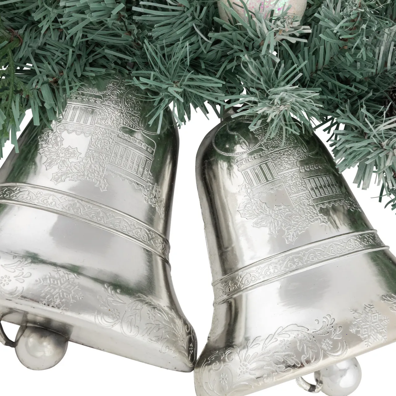- Accented with white iridescent ball ornaments and frosted pinecones