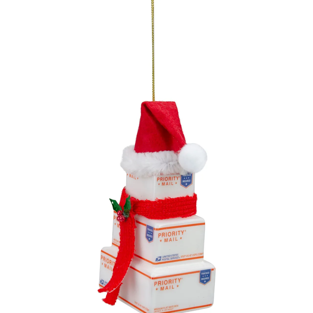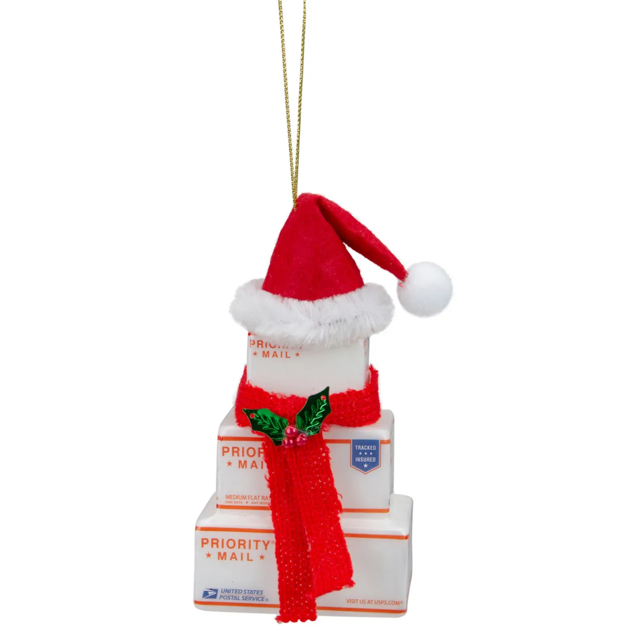 - Stacked Priority Mail packages draped with knit scarf and Santa hat