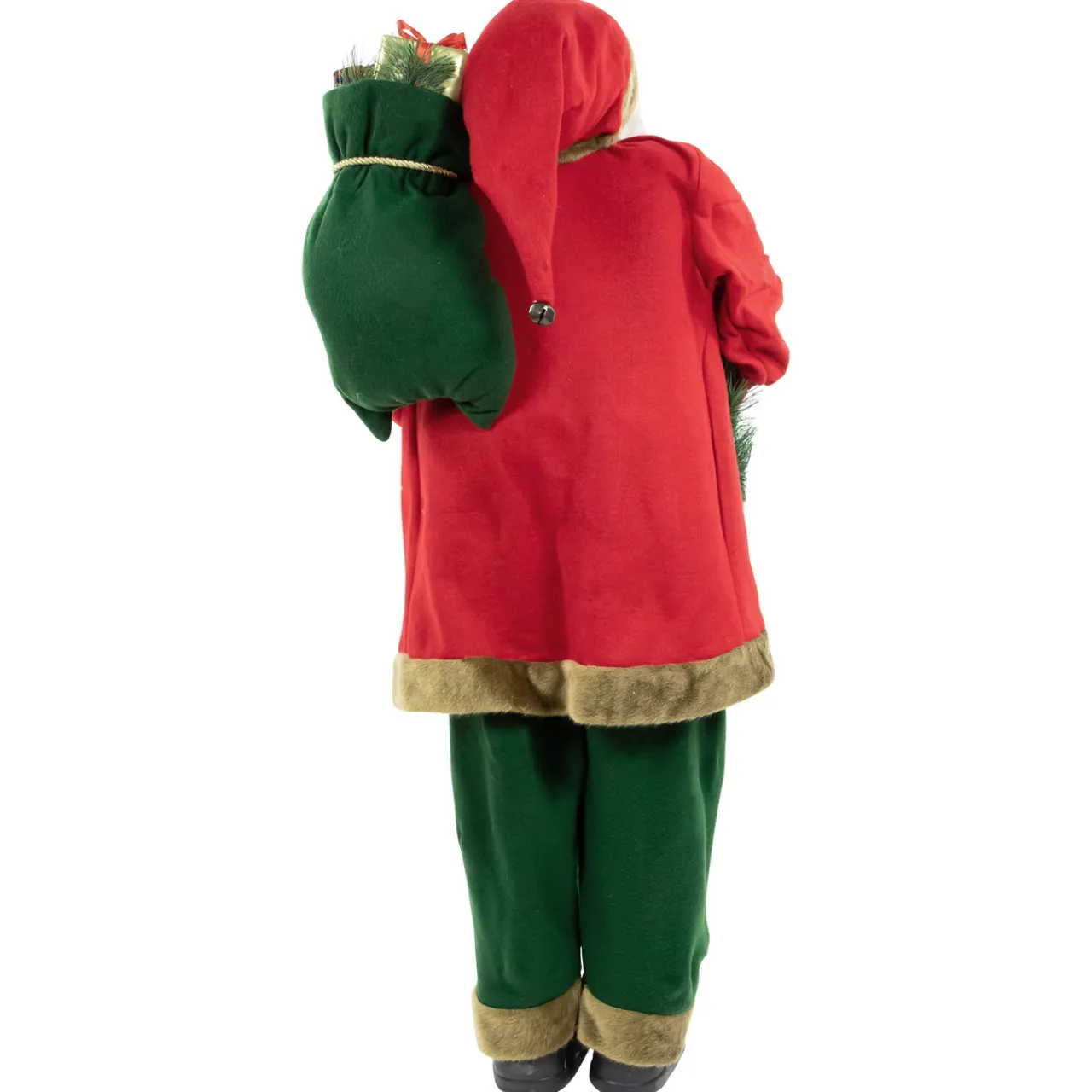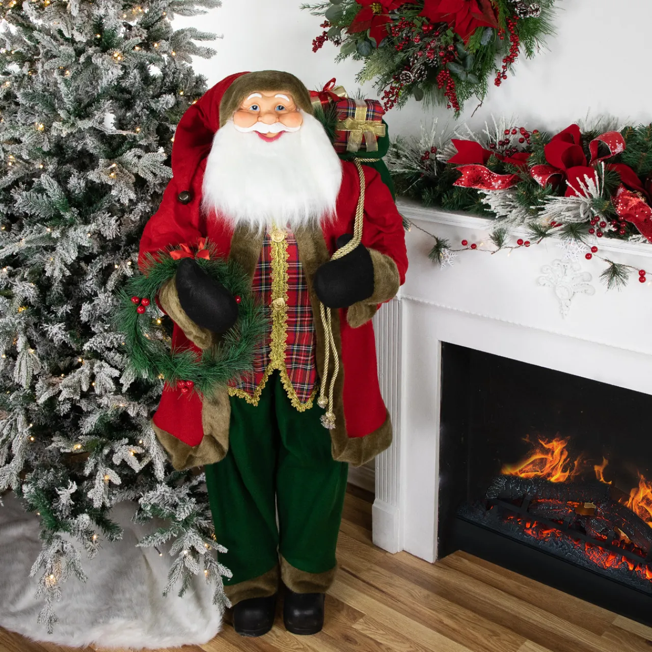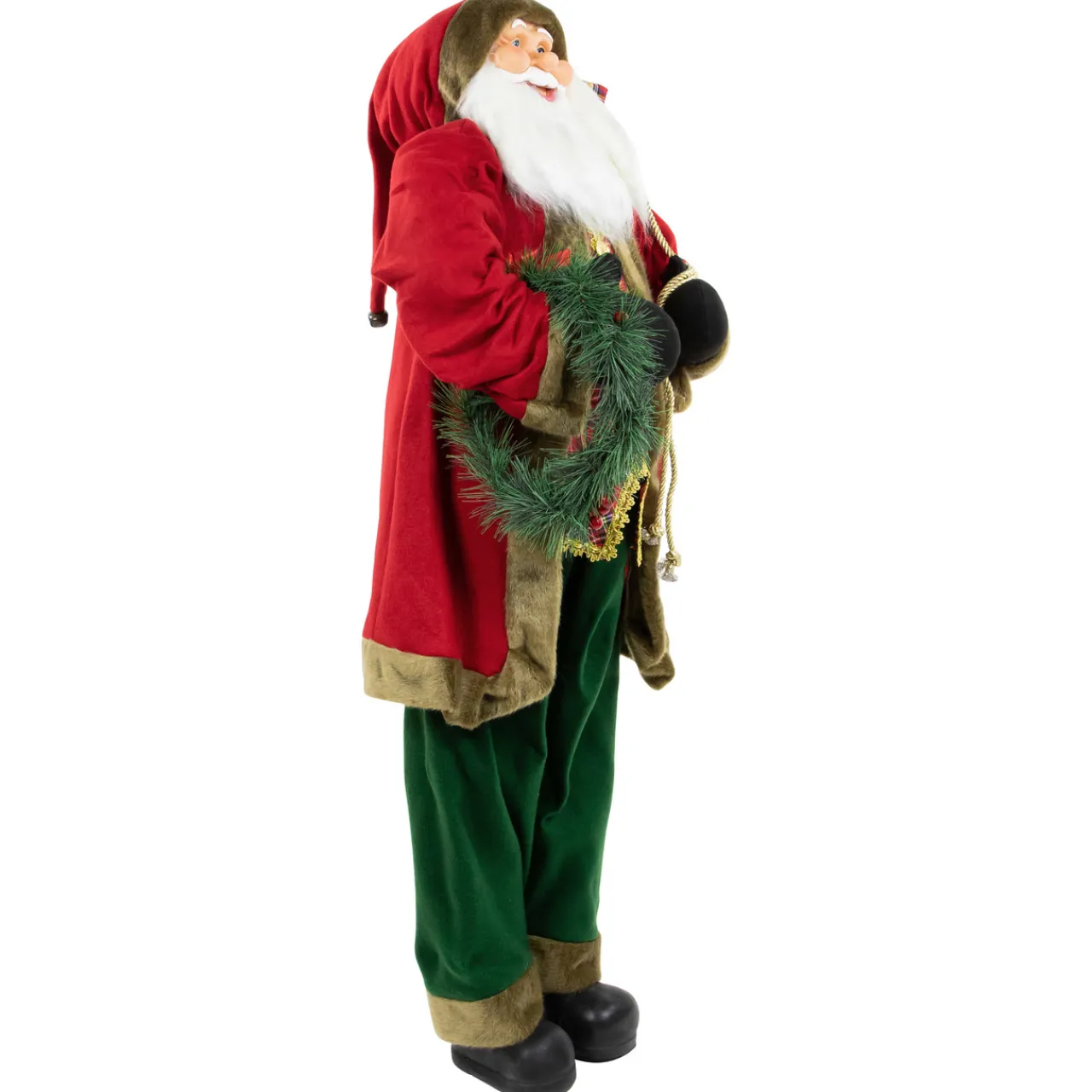 - He is carrying a wreath in one hand and a bag full of presents over his shoulder