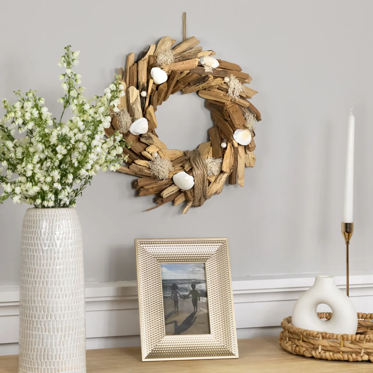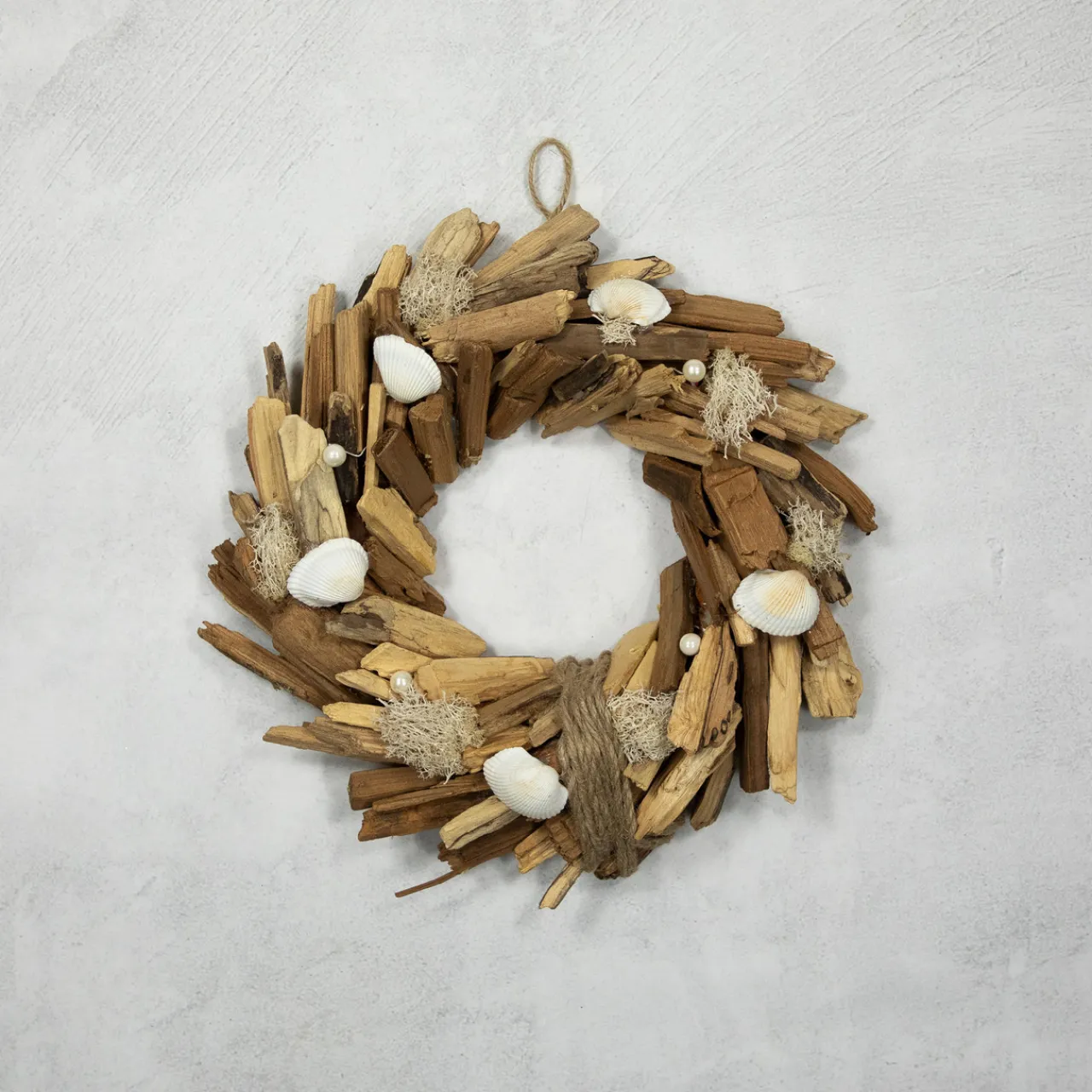 Accented with seashells, moss and faux pearls yn hues of beige and white