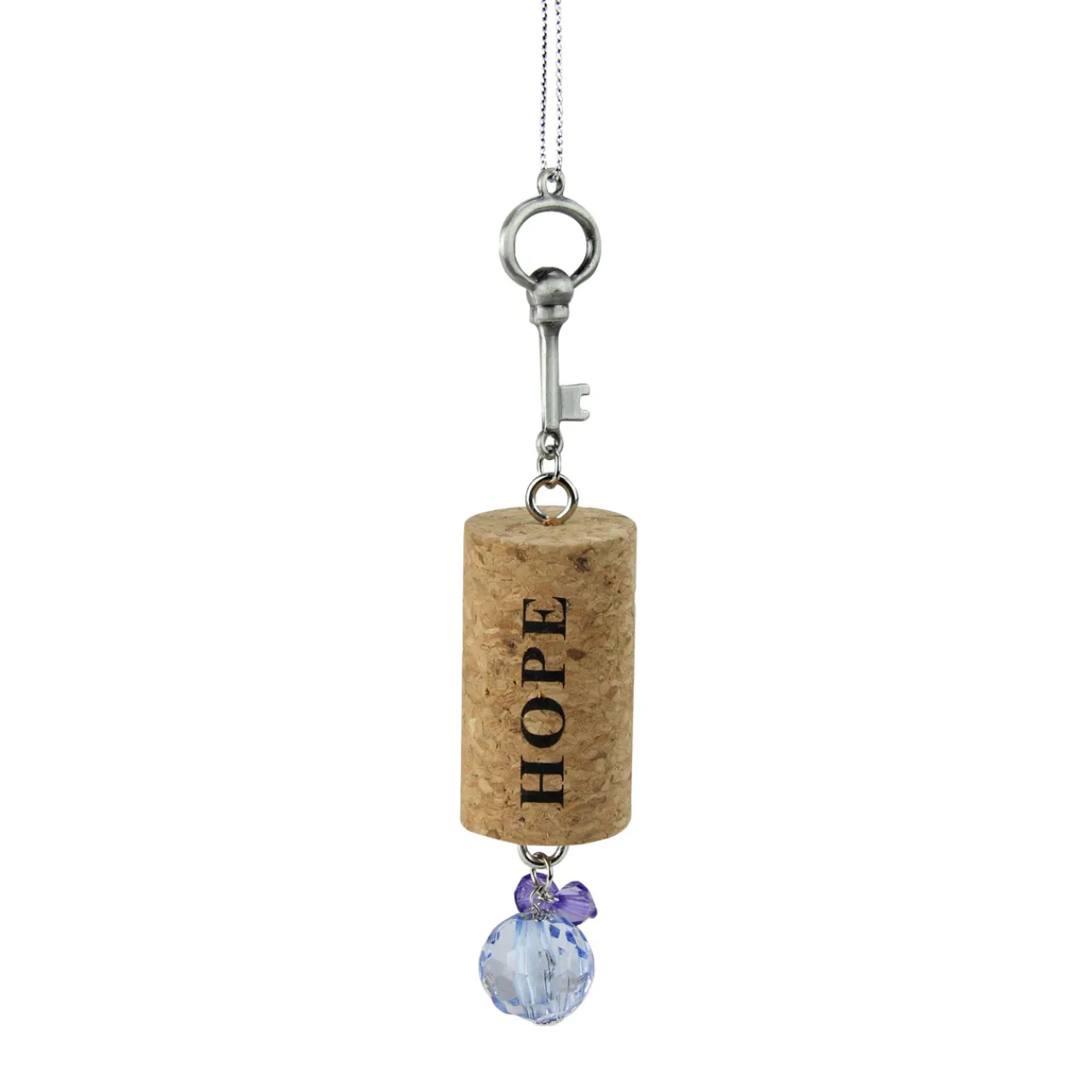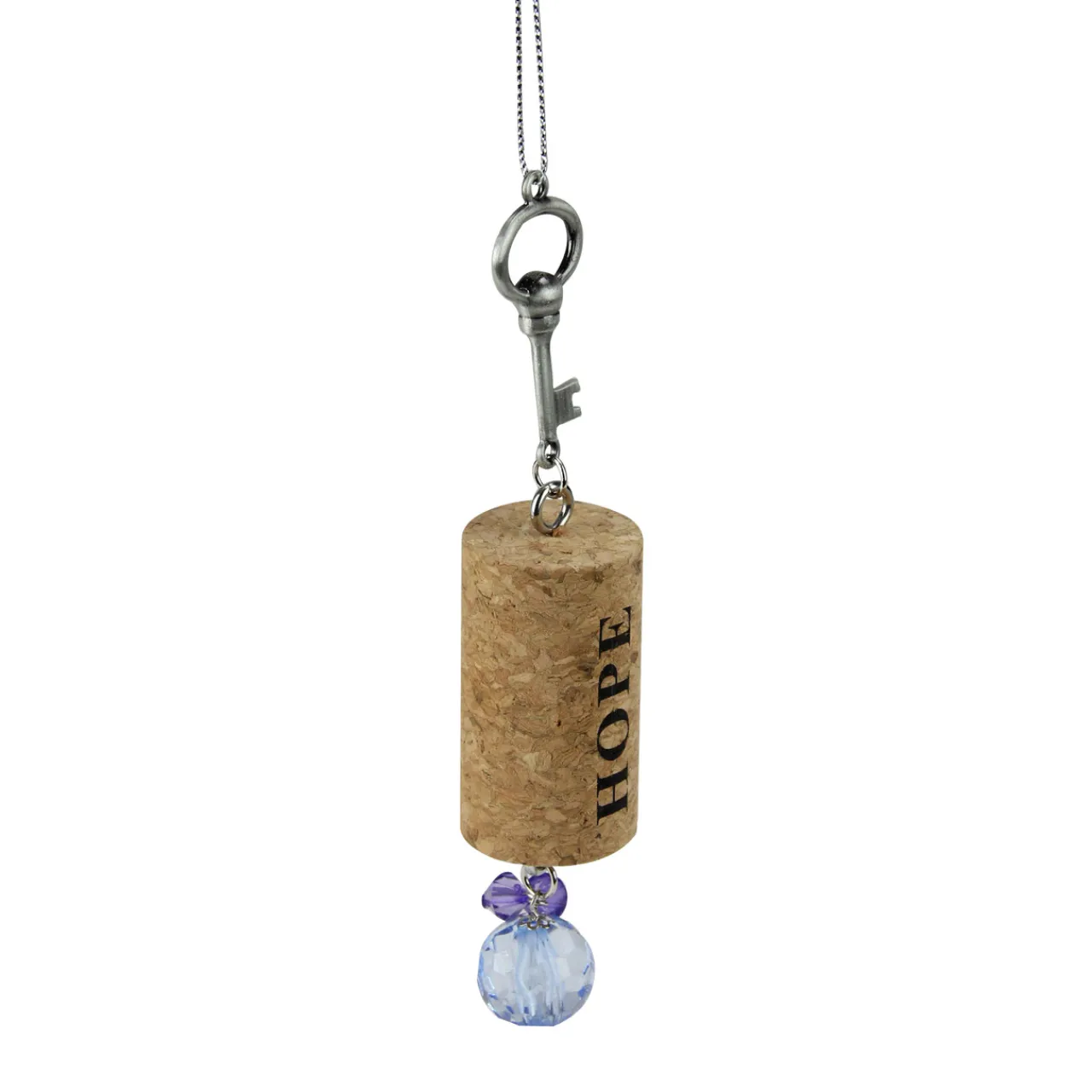 Ornament provides a welcomed unique juxtaposition of a simplistic cork with the chic and shiny embellishments seen in the barrel key and blue faceted charms